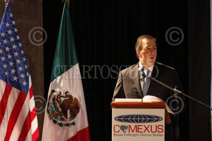 MÉXICO, D.F., 28JUNIO2013.- José Antonio Meade, secretario de Relaciones Exteriores durante la despedida de la generación 2013 de mexicanos becados "FulBright-Garcia Robles" FOTO: MISAEL VALTIERRA / CUARTOSCURO.COM