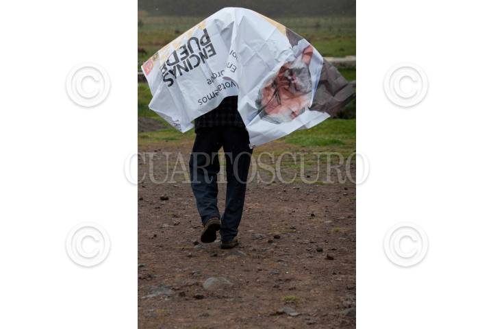 AMANALCO DE BECERRA, ESTADO DE MÉXICO, 21JUNIO2011.- Alejandro Encinas Rodríguez, candidato de la coalición “Unidos Podemos Más” para la gubernatura del Estado de México, se reunió con productores de trucha donde firmo el pacto ecológico. Un simpatizante se cubre de la lluvia con una manta con la foto del candidato. FOTO: GUILLERMO PEREA/CUARTOSCURO.COM