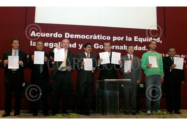 MEXICO, D.F., 13JUNIO2006.- Alberto Begne, Alternativa, Alberto Anaya, PT, Leonel Cota Montaño, presidente nacional del PRD, Manuel Espino, presidente del PAN, Luis Carlos Ugalde, consejero presidente del IFE, Mariano Palacio Alcocer, Presidente del PRI, Jorge Emilio González Martínez y Luis Maldonado Venegas, Convergencia, firmaron el llamado Acuerdo Democrático por la Equidad, la Legalidad y la Gobernabilidad, en la sede del instituto electoral. FOTO: Moisés Pablo/CUARTOSCURO.COM