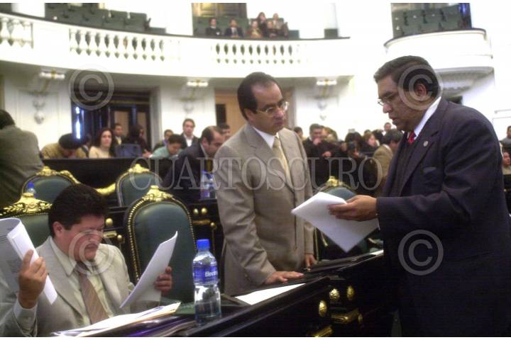 México D.F. 26DIC2003.- Rene Bejerano, (PRD) y Mauricio López, (PRI) conversan en la sesión de la Asamblea Legislativa del D.F en donde los asambleistas rechazaron la iniciativa para crear la Secretaría de Educación Pública y Cultura en esta capital y aprobó las reformas al Código Civil para agilizar los trámites del Registro en la materia. FOTO: Eunice Adorno/CUARTOSCURO.COM