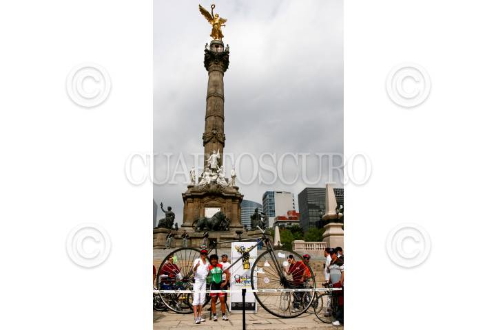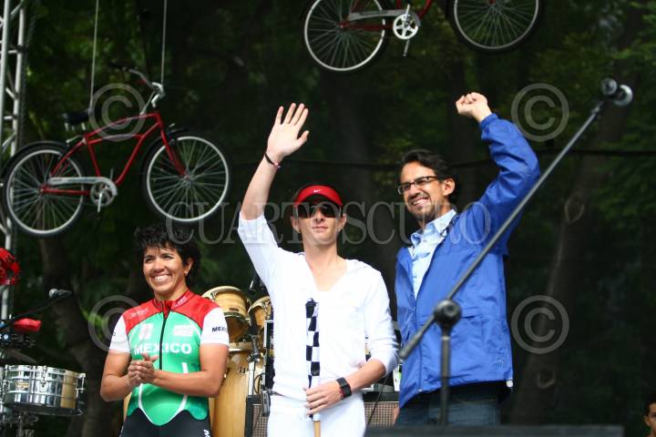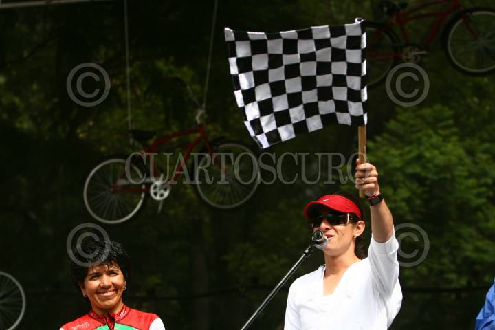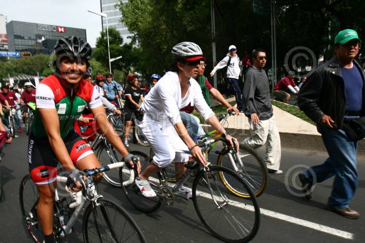 MÉXICO, D.F., 29JUNIO2008.- Belen Guerrero, medallista olimpica en ciclismo, Ana Gabriela Guevara, titular del Instituto del Deporte del DF y Javier Hidalgo, titular del Instituto de la Juventud DF, dieron el banderazo de salida del Ciclotón que este fin de semana cumplió su 1er. Aniversario, la ruta fue del Angel de la Independencia a la Alameda Central. FOTO: IVÁN MENDEZ/CUARTOSCURO.COM