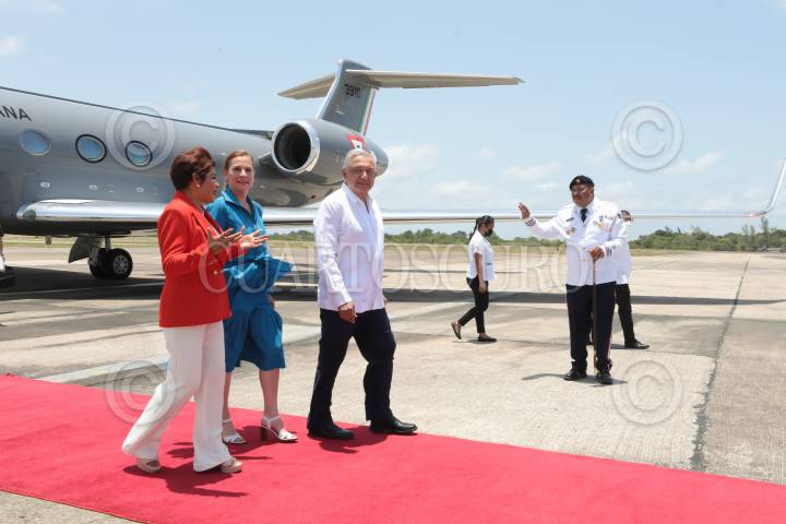 Arribo de Andrés Manuel López Obrador y Beatríz Gutiérrez Müller a Belice para la firma del acuerdo del programa Sembrando Vida.