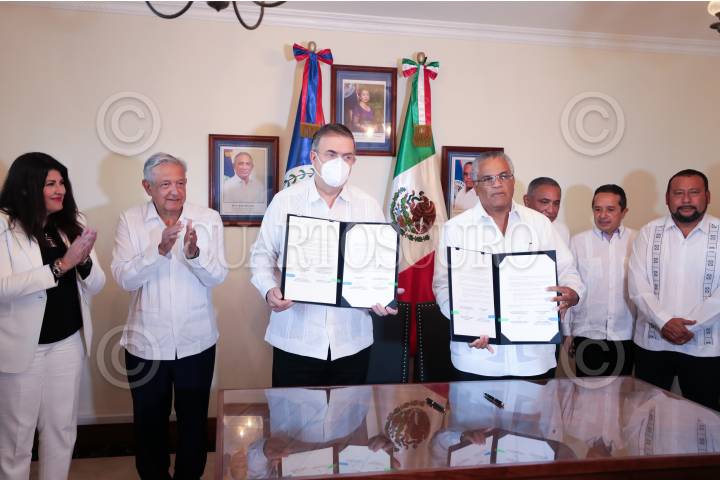 Firma del acuerdo entre México y Belice para el desarrollo del programa Sembrando Vida a cargo del canciller Marcelo Ebrard y John Briceño. El presidente Andrés Manuel López Obrador estuve presente durante la firma