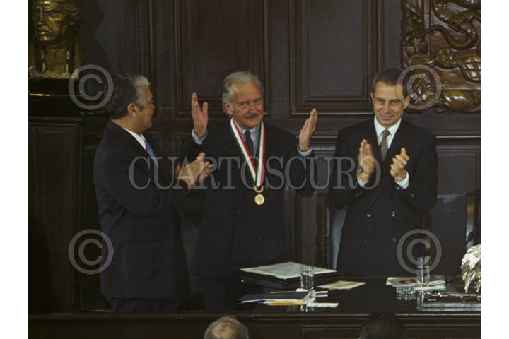 MÉXICO, D.F., 16MAYO2012.- El escritor Carlos Fuentes, falleció el dia de hoy a la edad de 80 años, tras una complicacion respiratoria en un hospital al sur de la ciudad. En la imagen Carlos Fuetes junto al presidente Ernesto Zedillo, recibe la medalla "Belisario Domínguez" por parte del Senado de la República el 07 de octubre de 1999. FOTO: VICTORIA VALTIERRA/ARCHIVO/CUARTOSCURO.COM