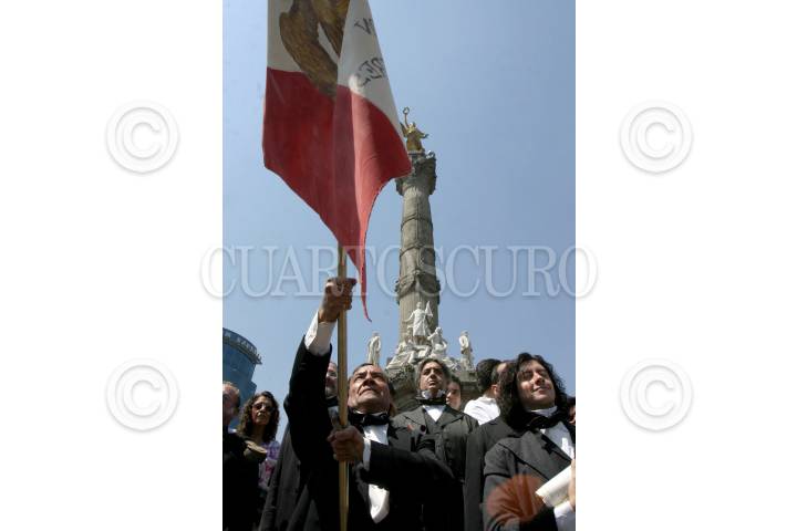 MEXICO, D.F., 21MARZO2006.- Una caravana alegórica del Benemérito de las Amèricas Benito Juàrez, se paseo por las avenidas principales de la capital, durante las festividades de los dos cientos años de su natalicio. En la inagen durante su paso por el Angel de la Independencia. FOTO: Pedro Marrufo/CUARTOSCURO.COM
