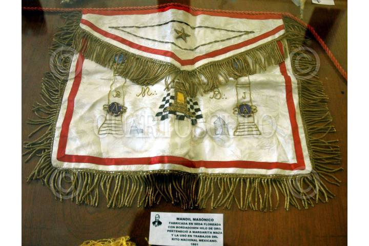 VERACRUZ, VER. 29ABRIL2008.- De manera temporal se exhiben articulos personales del benemérito de las américas, Benito Juarez Garcia, en las instalaciones del recinto de la reforma en el puerto de Veracruz. En la foto se observa el mandil masónico que perteneciera a Margarita Maza de Juarez fabricado en seda floreada y bordado con hilo de oro, utilizado en 1861. FOTO: JOSÉ CANDELARIO/CUARTOSCURO.COM