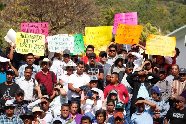 GUELATAO DE JUÁREZ, OAXACA, 21MARZO2025.- Un grupo de integrantes de la Sección 22 de la Coordinadora Nacional de Trabajadores de la Educación (CNTE) mostraron pancartas y gritaron consignas contra la Ley del ISSSTE durante el homenaje por el 219 aniversario del natalicio de Benito Juárez en la comunidad serrana de Guelatao de Juárez, Oaxaca, encabezado por la presidenta de la República Claudia Sheinbaum Pardo. FOTO: CAROLINA JIMÉNEZ/CUARTOSCURO.COM