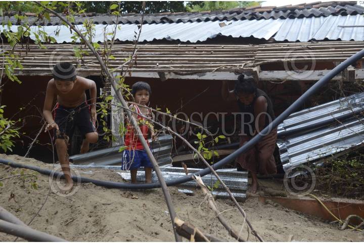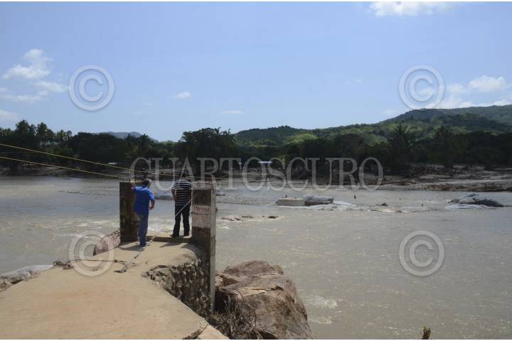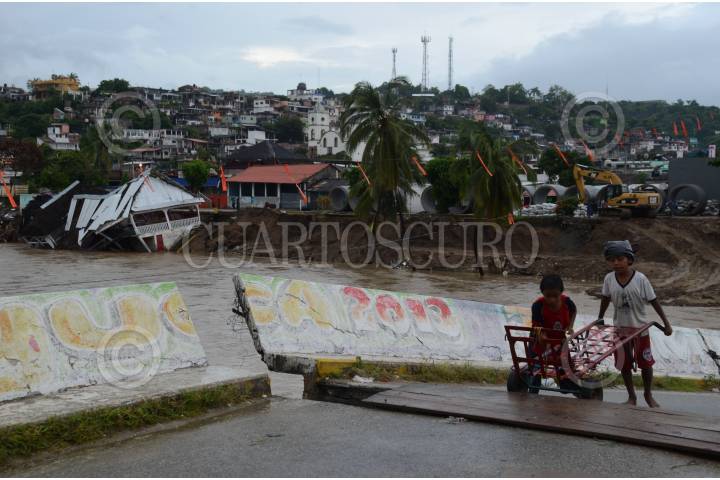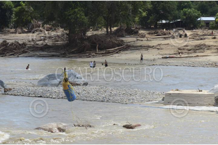 BARRIO NUEVO LA LAJA, COYUCA DE BENÍTEZ.- A 17 días del paso de la tormenta tropical Manuel continúan incomunicados los habitantes de la comunidad enclavada en la sierra de Coyuca de Benítez. Solamente atraviesan las corrientes del río en una tirolesa sujeta de lado a lado mediante un cable de acero al que amarraron de forma improvisada a un tambo y que jalan con mecate para atravesar e ir por víveres. Las familias que perdieron sus viviendas viven refugiados en la escuela primaria del poblado que salvó de las inundaciones junto con la iglesia que se encuentran en la parte más alta. Ambos sitios albergaron a las 140 familias que habitan en Barrio Nuevo. FOTO: BERNANDINO HERNÁNDEZ /CUARTOSCURO.COM