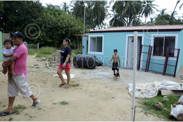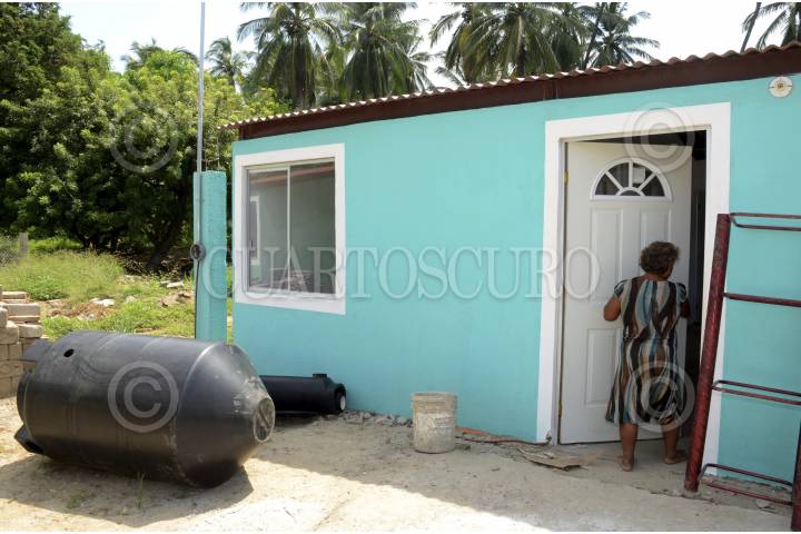 COYUCA DE BENÍTEZ, GUERRERO, 38AGOSTO2014.- Damnificados de la tormenta Manuel de las colonias Tierra Digna, Zumpango y Cimientos de la Cabecera municipal que recibieron hace dos meses sus viviendas construidas por la Sedatu denunciaron la mala calidad de las edificaciones construidas una vez que registran levantamiento del piso, puertas y ventanas en mal estado y la no colocación de los biodigestores quienes los mismos propietarios los estan colocando. FOTO: BERNANDINO HERNÁNDEZ /CUARTOSCURO.COM