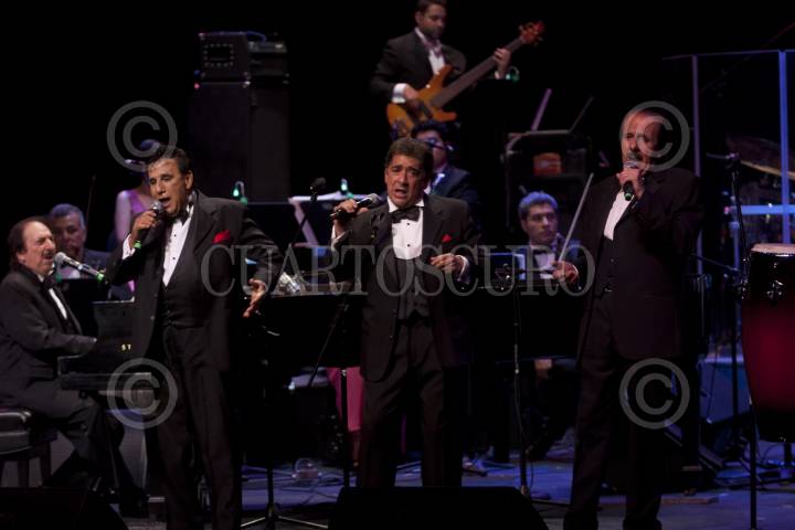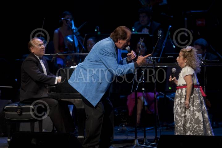MÉXICO, D.F., 03AGOSTO2012.- El director Musical, Arturo Castro, Gualberto Castro, Jorge Castro Jr. y Benito Castro, ofrecieron un concierto la noche de ayer en el Teatro de la Ciudad con motivo del homenaje por sus 50 años de trayectoria le rindió el Gobierno del DF, la Asociación Nacional de Actores y La Sociedad de Autores y Compositores y La Sociedad de Locutores. Entre los invitados que compartieron escenario estuvieron los maestros Armando Manzanero, Kiko Campos, Felipe Gil, Manuella Torres y la cómica María Elena Saldaña. FOTO: FRANCISCO RODRÍGUEZ /CUARTOSCURO.COM