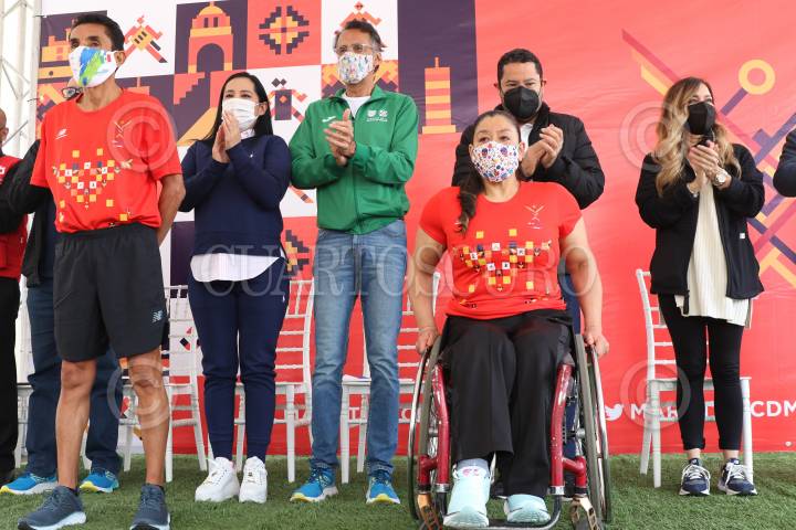 Maratonistas como Benjamín Paredes e Ivonne Reyes portan la playera que utilizarán los corredores de la edición XXXVIII del Maratón de la Ciudad de México Telcel 2021.