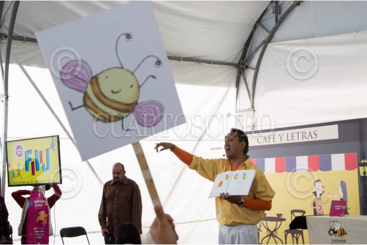 MÉXICO, D.F., 15NOVIEMBRE2015.- El escritor para niños Rodrigo Vargas, presentó su colección de libros interactivos durante la Feria Internacional del Libro Infantil y Juvenil, los cuales motivan a los infantes un acercamiento más fácil hacía la lectura. La actividad se realizó en las instalaciones del Centro Nacional de las Artes (CENART) donde Benjamin Briseño fue el narrador y actor del libro “Tres Abejas” uno de los tres títulos presentados. Al final de la presentación Rodrigo firmo los libros que los asistentes adquirían en el stand. FOTO: GALO CAÑAS /CUARTOSCURO.COM