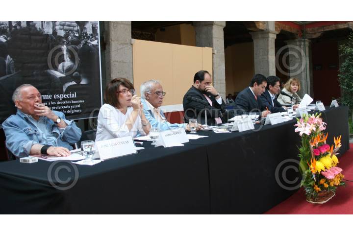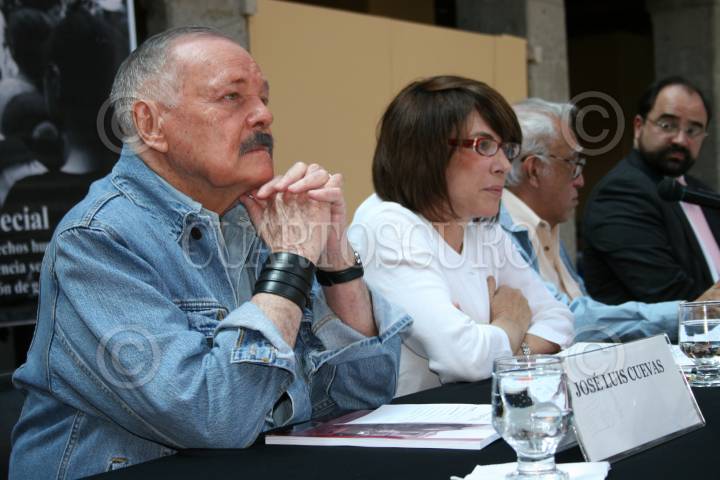 MÉXICO, D.F., 06OCTUBRE2008.- Emilio Álvarez Icaza, presidente de la CDHDF, presentó esta mañana el ¨Informe Especial sobre Violaciones a los Derechos Humanos por Orientación o Preferencia Sexual y por Identidad o Expresión de Genero¨, en el Museo José Luis Cuevas. De izquierda a derecha; Josè Luis Cuevas, Sabina Berman, Carlos Monsiváis, Emilio Álvarez Icaza, Juan José García Ochoa; subsecretario de gobierno del DF, Alejandro Brito; representante del comite asesor para el informe y Beatriz del Carmen Cuevas. FOTO: MISAEL VALTIERRA/CUARTOSCURO.COM