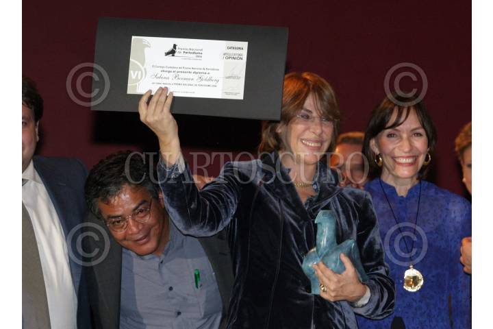 MÉXICO, D.F., 03MAYO2007.- El periodista Sabina Berman Goldberg recibió el Premio Nacional de Periodismo 2006 por su trabajo "Felipe Calderón Tribulaciones de la Fé" presentado en la Revista Letras Libres le entregó el reconocimiento Pedro Valtierra, director de la revista Cuartoscuro durante la ceremonia que tuvó el lugar en el Lunario. FOTO: MOISÉS PABLO/CUARTOSCUOR.COM