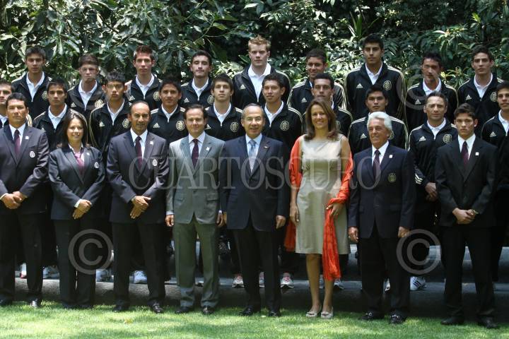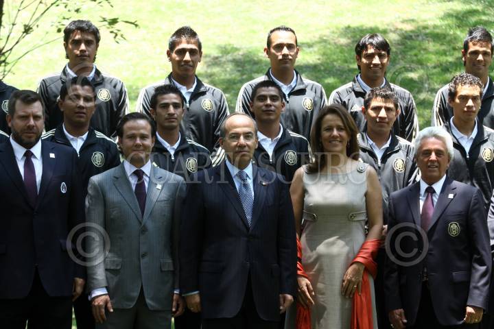 MÉXICO, D.F., 09JUNIO2011.- El presidente Felipe Calderón acompañado de su esposa Margarita Zavala, Bernardo de la Garza, titular de la Conade y Justino Compean, presidente de la Federación Mexicana de Fútbol durante la toma de fotografía oficial en el evento del abanderamiento de las Selecciones Nacional de Fútbol Sub 17, Femenil Mayor y de Playa que se realizo en la residencia oficial de Los Pinos. FOTO: RODOLFO ANGULO/CUARTOSCURO.COM