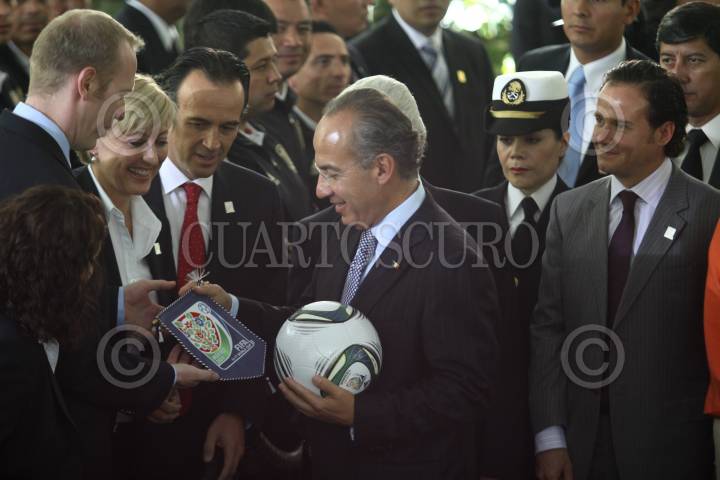 MÉXICO, D.F., 09JUNIO2011.- El presidente Felipe Calderón acompañado de su esposa Margarita Zavala, Justino Compean, presidente de la Federación Mexicana de Fútbol y Bernardo de la Garza, titular de la Conade al termino del evento del abanderamiento de las Selecciones Nacional de Fútbol Sub 17, Femenil Mayor y de Playa que se realizo en la residencia oficial de Los Pinos. FOTO: RODOLFO ANGULO/CUARTOSCURO.COM