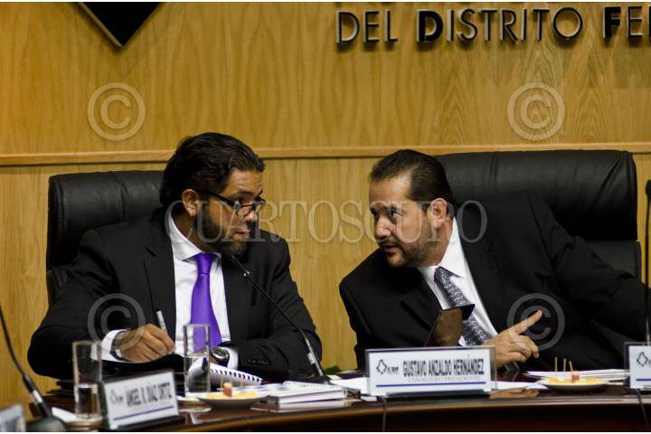 MÉXICO, D.F., 07OCTUBRE2011.- Gustavo Anzaldo Hernández y Bernardo Valle Monroy, presidente y secretario del Consejo General del Instituto Electoral del Distrito Federal (IEDF), dialogan durante la sesión extraordinaria del Consejo General del Instituto Electoral del Distrito Federal (IEDF), en la que se hizo la "Declaratoria formal del inicio del Proceso Electoral Ordinario de 2011-2012". FOTO: MISAEL VALTIERRA/CUARTOSCURO.COM