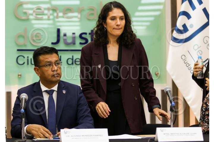 CIUDAD DE MÉXICO, 20AGOSTO2025.- Bertha Alcalde Luján, fiscal General de Justicia de la capital, y Pablo Vázquez, secretario de Seguridad Ciudadana, durante conferencia de prensa en la que se ofrecieron detalles sobre la detención de las trece personas implicadas en el asesinato de Ximena y José, colaboradores de Clara Brugada, jefa de Gobierno. FOTO: MARIO JASSO/CUARTOSCURO.COM