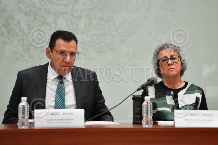 CIUDAD DE MÉXICO, 30JULIO2025.- Carlos Lerma Cortés subsecretario de ingresos de la Secretaría de Hacienda y Crédito Público (SHCP), y Bertha Gómez Castro secretaría de egresos de la SHCP, durante conferencia de prensa realizada en el salón de usos múltiples de Palacio Nacional en la que presentaron las finanzas públicas correspondientes al segundo trimestre de 2025. FOTO: MARIO JASSO/CUARTOSCURO.COM