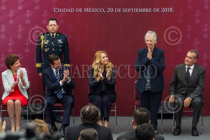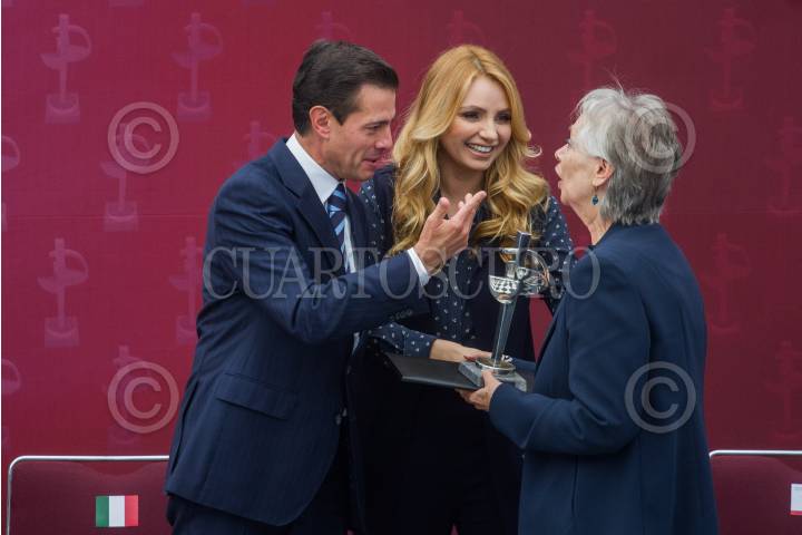 CIUDAD DE MÉXICO, 20SEPTIEMBRE2018.- La productora Bertha Navarro recibió el galardón Luz de Plata, por su trayectoria cinematográfica, de manos del presidente Enrique Peña Nieto. En la imagen los acompaña María Cristina García Cepeda, secretaria de Cultura, la Primera Dama Angélica Rivera y Jorge Sánchez Sosa, director del Imcine. FOTO: ISAAC ESQUIVEL /CUARTOSCURO.COM