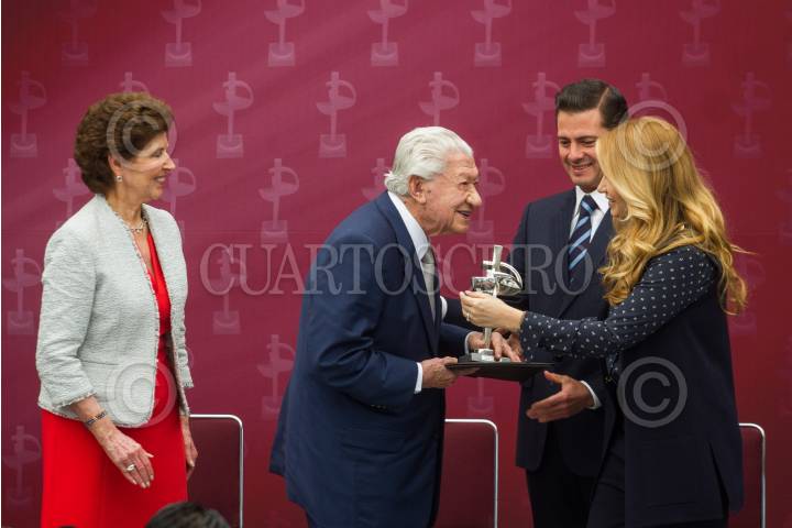 CIUDAD DE MÉXICO, 20SEPTIEMBRE2018.- El primer actor Ignacio López Tarso recibió el galardón Luz de Plata, por su trayectoria cinematográfica, de manos del presidente Enrique Peña Nieto. En la imagen los acompaña María Cristina García Cepeda, secretaria de Culturay la Primera Dama Angélica Rivera. FOTO: ISAAC ESQUIVEL /CUARTOSCURO.COM