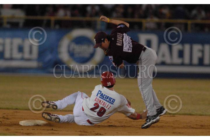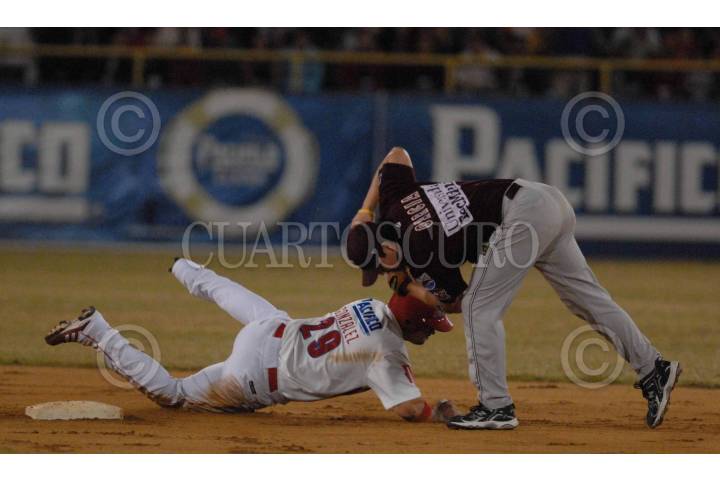 MAZATLÁN, SINALOA 13ENERO2006.- Ayer por la noche en el estadio Teodoro Mariscal se enfrentaron los equipo de beisbol, los Venados de Mazatlán y los Tomateros de Culiacán por el pase a la final de la Liga Mexicana del Pacifico. Los guindas se impusieron en el primero de la serie.El segunda base Nicolas García pone fuera a Adrian González. FOTO: EL DEBATE DE MAZATLÁN