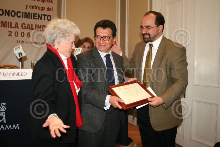 MÉXICO, D.F. 24NOVIEMBRE2006.- La CNDHDF entregó el premio Hermilia Galindo. En la imagen, Emilio Álvarez Icasa galardonando a Carlos Welt, acompañado de Elizabeth Beteta. FOTO: PAOLA HIDALGO/CUARTOSCURO.COM