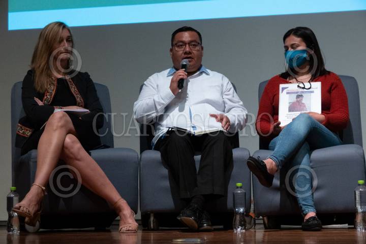 María Eloísa Mendoza; Tomás Leopoldo Sarabia, y Bibiana Mendoza durante la presentación del informe 2022 de la organización Artículo 19 en el Museo de Memoria y Tolerancia.