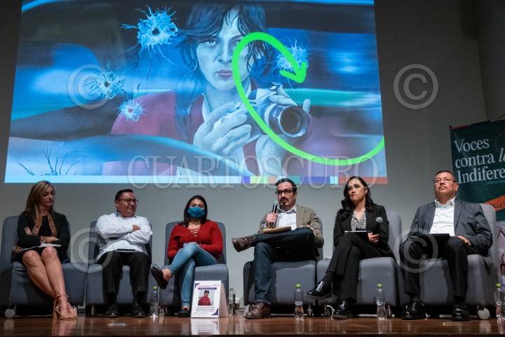 María Eloísa Mendoza; Tomás Leopoldo Sarabia; Bibiana Mendoza; Leopoldo Maldonado; Adela Navarro y Raymundo Ramos durante la presentación del informe 2022 de la organización Artículo 19 en el Museo de Memoria y Tolerancia.