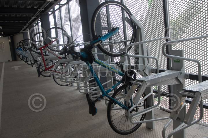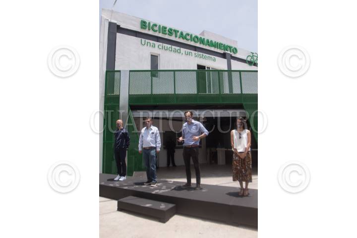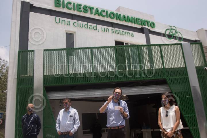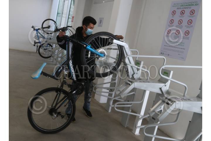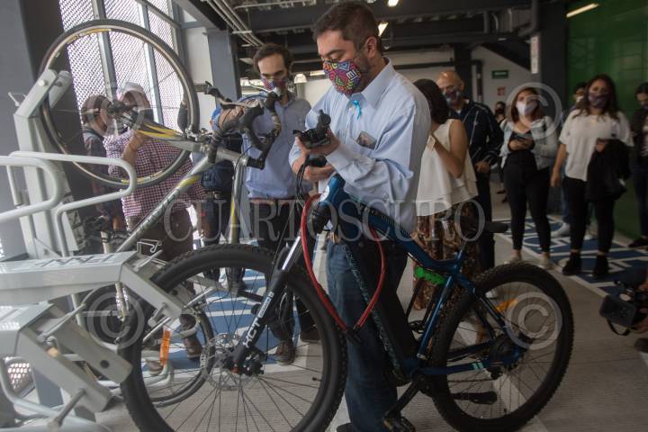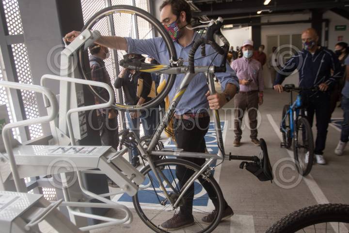 El primer usuario del Biciestacionamiento del Metro Escuadrón 201 colocó su bicicleta durante la apertura
