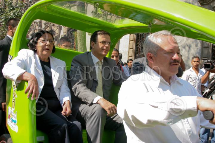 MÉXICO D.F., 11MARZO2009.- La Autoridad del Centro Histórico, Alejandra Moreno Toscano y Marcelo Ebarad Casaubon Jefe de Gobierno del Distrito Federal, recorrieron el circuito del Zócalo en una de las nuevas unidades llamadas Tricitaxis que circularan muy pronto por el Centro Histórico. FOTO: RICARDO CASTELAN/CUARTOSCURO.COM
