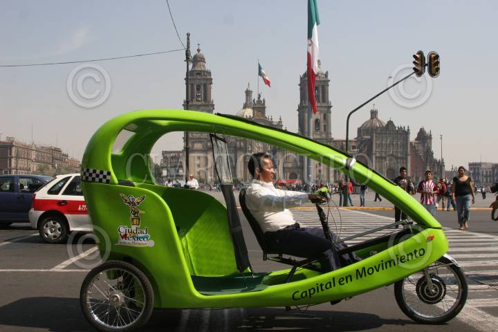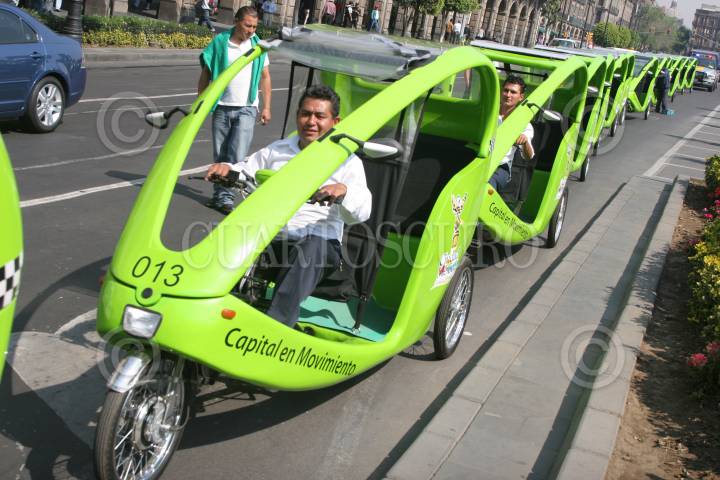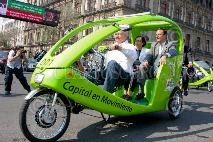 MÉXICO D.F., 11MARZO2009.- El Gobierno del Distrito Federal presento los nuevos Tricitaxis que sustituirán a los antiguos bicitaxis, Marcelo Ebrad destacó que la ruta de las unidades ayudarán mucho para cambiar la forma de movilidad en el Centro Histórico, donde se busca cada vez haya menos vehículos y más peatones, por lo que se arreglan las banquetas y el tipo de pavimento. FOTO: RICARDO CASTELAN/CUARTOSCURO.COM