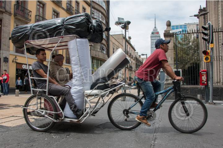 CIUDAD DE MÉXICO, 30SEPTIEMBRE2019.- Bicitaxi transporta a un par de personas y diversos productos por las calles de el Centro Histórico. FOTO: ROGELIO MORALES /CUARTOSCURO.COM