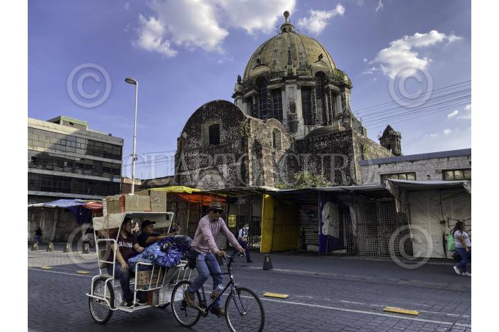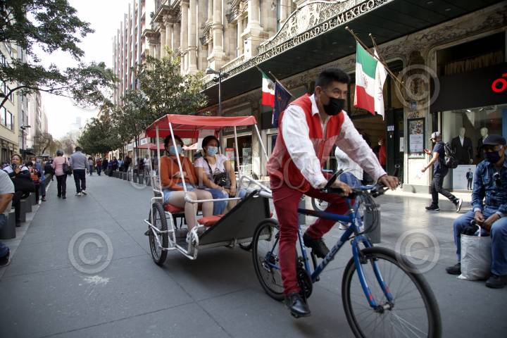 Un bicitaxi recorre las calles del centro histórico de la Ciudad de México paseando a visitantes.