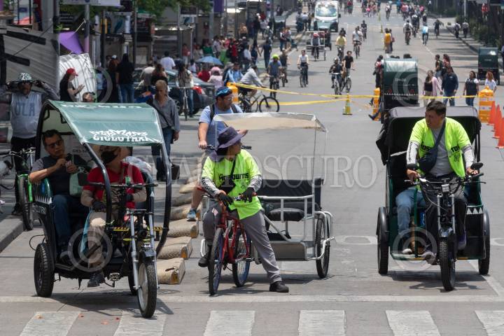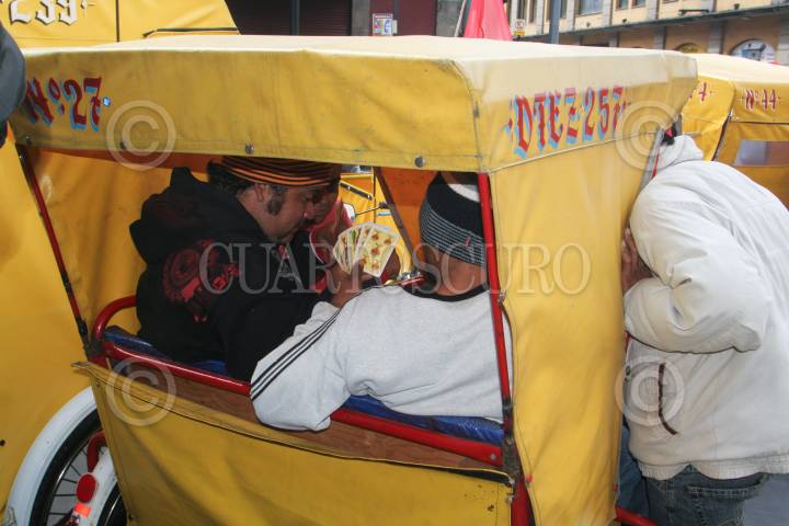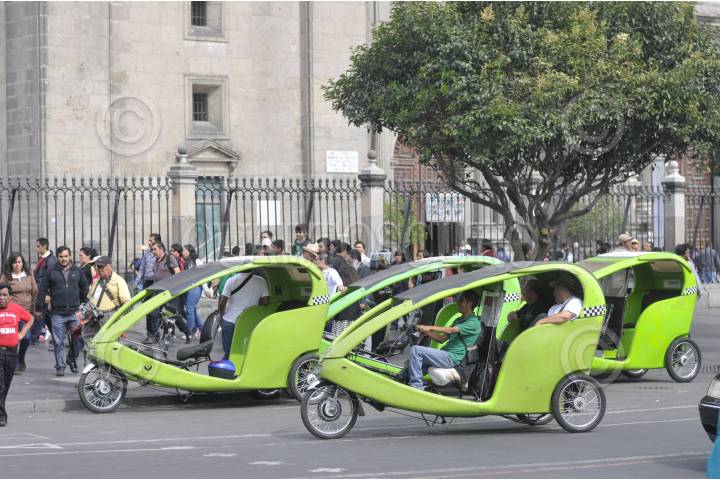 MÉXICO, D.F., 29DICIEMBRE2013.- La cantidad de bicitaxis en el Centro Histórico, que cobran de 30 a 100 pesos dependiendo el viaje, ha ido en aumento durante los últimos meses debido al desempleo en en país y la demanda de viajes cortos en la periferia del primer cuadro de la ciudad. FOTO: DIEGO SIMÓN SÁNCHEZ /CUARTOSCURO.COM