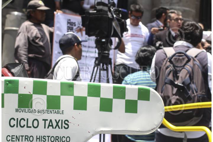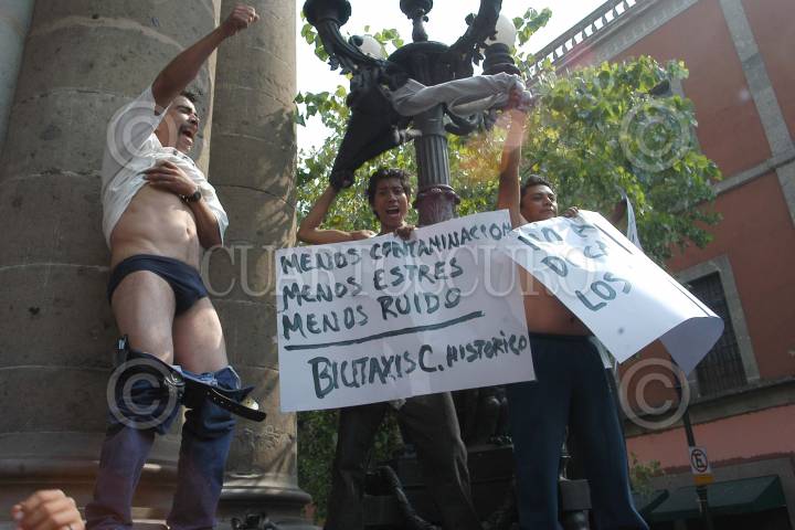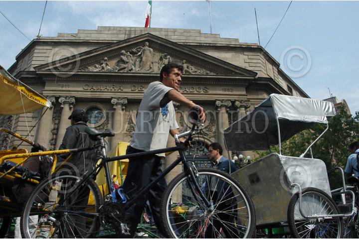 MEXICO D.F. 07DICIEMBRE2004.- Un centenar de operadores de bicitaxis se manifestaron frente a la ALDF, exigen que puedan trabajar en la zona del centro historico sin que sean detenidos sus triciclos. FOTO: Germán Romero/CUARTOSCURO.COM
