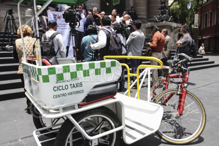 CIUDAD DE MÉXICO, 28JUNIO2016.- El diputado por Morena, Alfonso Suárez del Real, dio conferencia en las escalinatas de la ALDF para presentar el prototipo de bicitaxi urbano, conocido como "mosquito". La unidad cuenta con un panel de celdas solares y una bicicleta conducida por un chofer. FOTO: MARÍA JOSÉ MARTÍNEZ /CUARTOSCURO.COM
