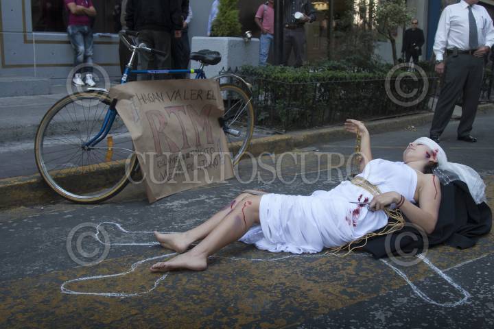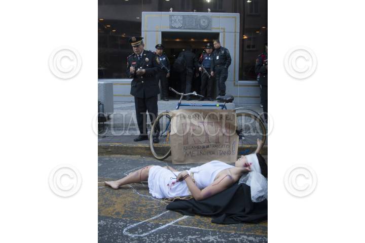 MÉXICO, D.F., 19FEBRERO2013.- Un reducido grupo de activistas y que representan a decenas de grupos en defensa de los derechos del ciclista, protestaron la mañana de hoy, frente a las instalaciones del la Secretaria de Seguridad Pública, por su omisión en la aplicación del Reglamento Metropolitano de Tránsito, que según los manifestantes deja al año cerca de 1200 muertes relacionadas al tráfico en esta ciudad. Además de representar a la "Justicia Atropellada" se entregó una carta con los motivos de la protesta. FOTO: FRANCISCO RODRÍGUEZ /CUARTOSCURO.COM
