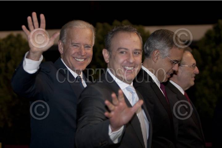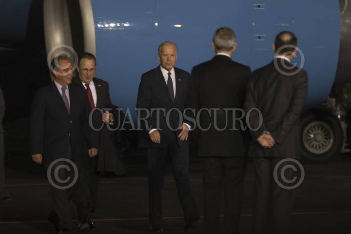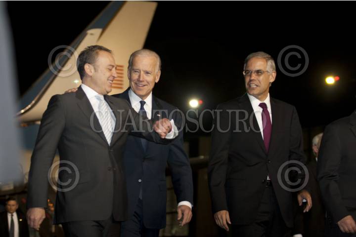 MÉXICO D.F.,04MARZO2012.- Joe Biden Vicepresidente de los Estados Unidos llego esta noche al hangar presidencial donde fue recibido por Arturo Sarukan Embajador de México en Estados Unidos, Julián Ventura subsecretario de Relaciones Exteriores Embajador y Anthony Wayne Embajador de los Estados Unidos en México. FOTO: GUILLERMO PEREA /CUARTOSCURO.COM