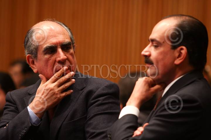 MÉXICO, D.F., 10JULIO2009.- Pablo Gomez senador del sol azteca, conversa con el consejero representante del PRI, Sebastián Lerdo de Tejada, durante la sesion extraordinaria del Consejo General del Instituto Federal Electoral FOTO: SÁSHENKA GUTIÉRREZ/CUARTOSCURO.COM