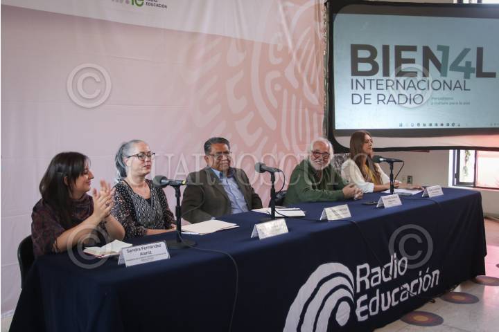 Jesús Alejo Santiago, director general de Radio Educación; Fernando Sánchez Mejorada, presidente de la RED México y Yessenia Castañeda Fernández, vicepresidente de Radio de la RED México durante la presentación de la convocatoria del 14° Bienal Internacional de Radio. El evento se llevó a cabo en el salón Benito Juárez, del Complejo Cultural Los Pinos.