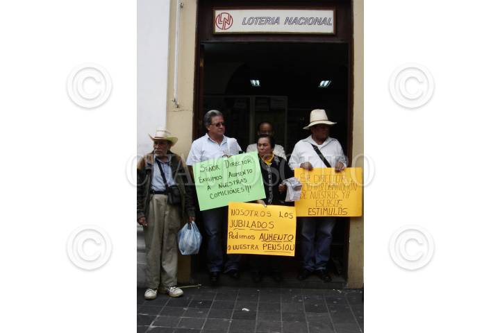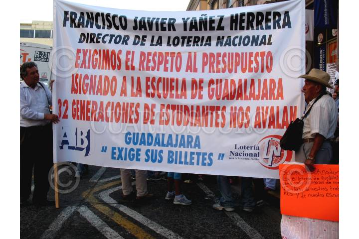 GUADALAJARA, JALISCO, 01OCTUBRE2008.- Miembros de la Asociación de Billeteros de Jalisco, se manifestaron ayer a las afueras del Palacio de la Lotería Nacional, en el centro de esta ciudad al grito de: "Billeteros unidos, jamás serán vencidos. Somos billeteros no somos limosneros". Los manifestantes le piden al Presidente de la República, Felipe Calderón Hinojosa, la destitución de Francisco Javier Yáñez Herrera director de la Lotería Nacional. Los manifestantes exigen que se le restituya la ayuda mensual de $17,200.00 pesos, que la Asociación de Billeteros utilizaba para nomina de maestros de el centro educativo en esta ciudad y que daba educación a más de 200 alumnos. Denunciaron, también, no haber recibido la entrega a tiempo de los billetes para la venta, lo que repercute en la economía de los vendedores. FOTO: MARIA DI PAOLA BLUM/CUARTOSCURO.COM