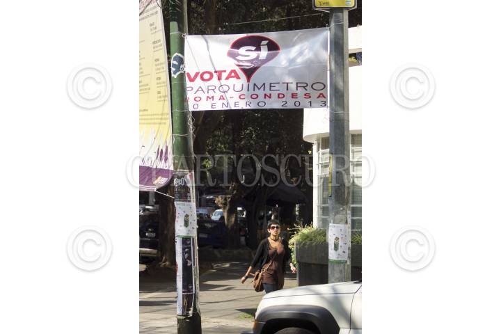 MÉXICO, D.F., 17ENERO2013.- El próximo domingo 20 de enero se realizará la consulta ciudadana para decidir la instalación de Parquimetros en las colonias Condesa y Roma. En las calles se pueden apreciar distintas mantas con la invitación a votar por la aceptación y algunas otras por la negativa. FOTO: ADOLFO VALTIERRA /CUARTOSCURO.COM