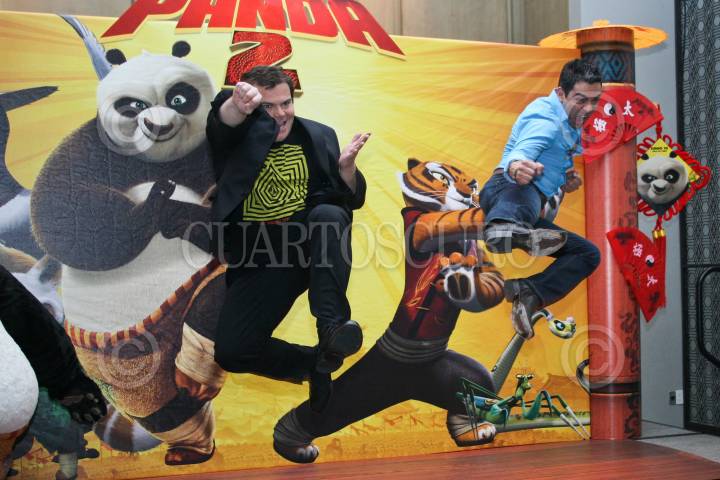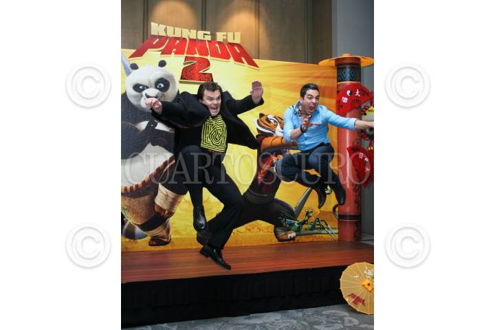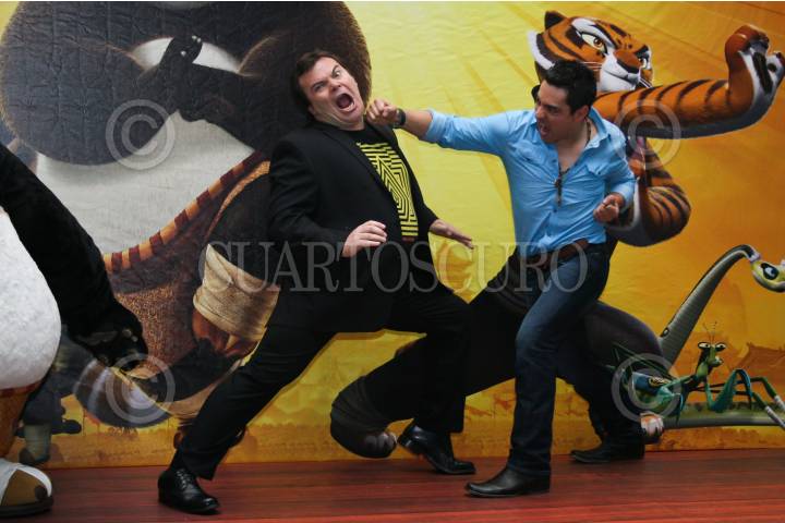 MÉXICO, D.F., 28MAYO2011.- Los actores Jack Black y Omar Chaparro, quienes dan voz en inglés y español al oso Po, durante la conferencia de la película Kung Fu Panda 2. FOTO: ISAAC ESQUIVEL/CUARTOSCURO.COM