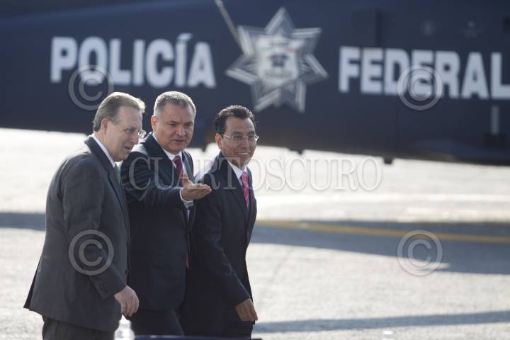 MÉXICO, D.F., 08DICIEMBRE2011.- Anthony Wayne, embajador norteamericano, Génaro García Luna, secretario de Seguridad Pública Federal, y Facundo Rosas, comisionado general de Policía Federal, arriban a el evento en donde se entregó un helicóptero tipo UH-60M Black Hawk por parte del gobierno estadunidense a la Secretaria de Seguridad, en el marco del Plan de Cooperación Mérida. Esta aeronave servirá para el combate al crimen organizado y se recibió en el Centro de Alto mando de la Policía Federal. FOTO: MOISÉS PABLO/CUARTOSCURO.COM