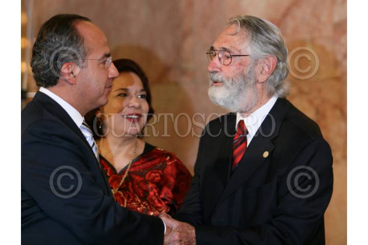 MÉXICO D.F., 17JULIO2008.- Felipe Calderón Hinojosa, Presidente de México y Donald Antonio Blair Rivas Mercado, hijo de Antonieta Rivas Mercado, durante la ceremonia de inauguración de la exposición "Antonieta Rivas Mercado" en el Palacio de Bellas Artes. FOTO: MOISÉS PABLO/CUARTOSCURO.COM