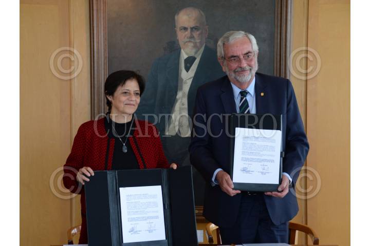 CIUDAD DE MÉXICO, 24OCTUBRE2019.- El rector de la UNAM, Enrique Graue Wiechers, y la directora general de la Comisión Nacional de Agua (Conagua), Blanca Elena Jiménez Cisneros, firmaron un convenio de colaboración para desarrollar diversas acciones encaminadas a fortalecer y expandir el conocimiento en materia de recursos hídricos. El acuerdo también está orientado a la especialización de recursos humanos en diferentes aspectos de la agenda hídrica; a organizar e implementar proyectos de investigación científica y de desarrollo tecnológico; estudios técnicos, administrativos y jurídicos, así como programas de posgrado, especialización y actualización profesional, entre otras acciones de interés mutuo. En la firma del convenio, el rector Graue resaltó la importancia de los recursos hídricos y de la formación de especialistas en el tema, y externó la disposición de la Universidad Nacional para llevar a cabo los proyectos que el país requiere con el objetivo de atender la problemática del agua y crear conciencia sobre su uso racional. FOTO: UNAM /CUARTOSCURO.COM