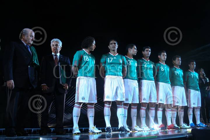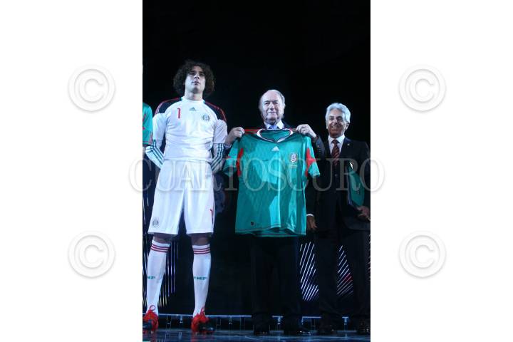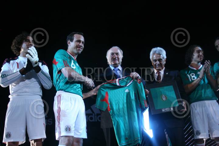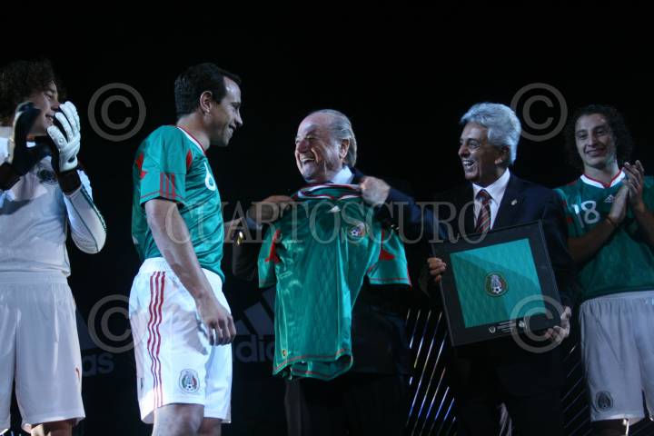 MEXICO, D.F., 09NOVIEMBRE2009.- Con la presencia de Joseph Blatter, presidente de la FIFA, en el Museo Nacional de Antropologia se presentó la playera que la selección mexicana utilizará en Sudáfrica 2010 . FOTO: SÁSHENKA GUTIERREZ/