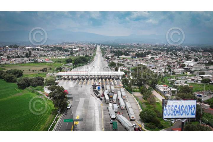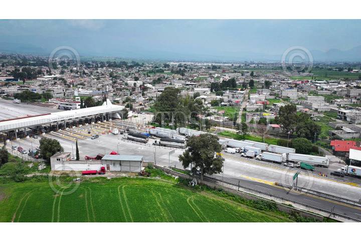 SAN MARCOS HUIXTOCO, ESTADO DE MÉXICO, 09AGOSTO2024.- Debido al cuarto día de bloqueo intermitente por parte de pobladores de Santa Rita Tlahuapan en la autopista México-Puebla, se mantienen las filas vehiculares para poder transitar por la zona. En imagen toma aerea de la caseta vehicular San Marcos. FOTOS: ROGELIO MORALES /CUARTOSCURO.COM