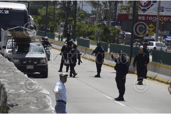 CHILPANCINGO, GUERRERO, 10SEPTIMBRE2016.- Profesores de la Coordinadora Estatal de Trabajadores de la Educación en Guerrero (CETEG) bloquearon un carril de la Autopista del Sol de Sur – Norte para entregar volantes informativos de sus movimientos y para pedir cooperación a los automovilistas. Policías federales con equipo antimotines acudieron al lugar y les pidieron abandonaran la arteria vehícular por lo que los profesores encabezados Carlos Botello Barrera se retiraron del lugar. FOTO: JOSÉ I. HERNÁNDEZ / CUARTOSCURO.COM